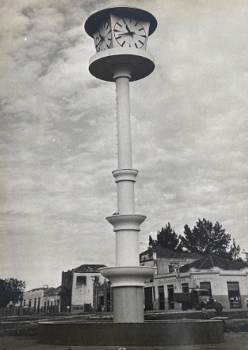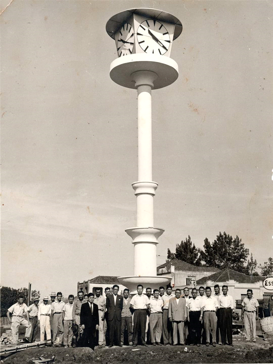 grande relógio, foi erguida de acordo com projeto elaborado pelo engenheiro Keitaro Yaguinuma (sobrinho de