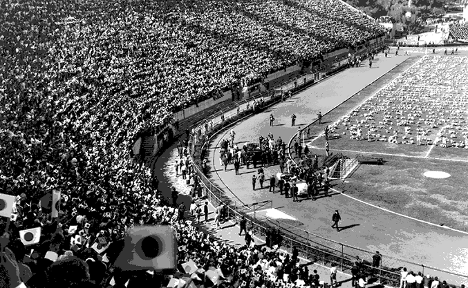 Os príncipes herdeiros Akihito e Michiko foram recepcionados por cerca de 80 mil pessoas no Estádio do Pacaembu,