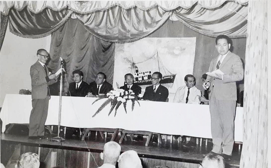 visível – identificação comprovada por outra foto da mesa). Em pé: Denshiro Saito – conduzindo o cerimonial.