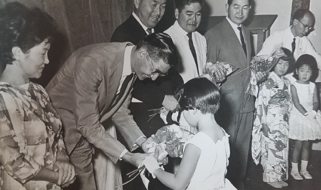 Paulista). 1964. Da esquerda para direita: Kin Saito, Mitsuo Marubayashi recebendo ramalhete de flores