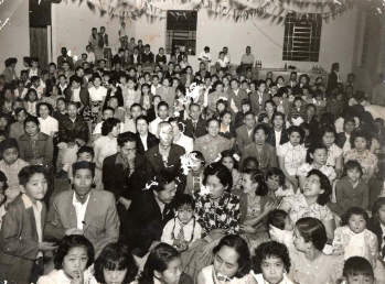 Abe, Massao Kariya (1º presidente) e, no centro, sentado de terno preto, o presidente da