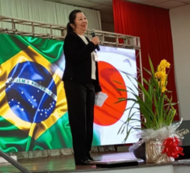 Etsuko Kakinohana Marubayashi dá as boas-vindas e manifesta seus