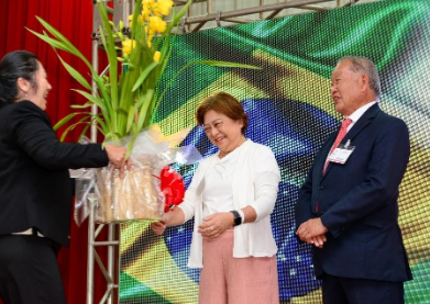O sr. Renato Ishikawa fez seu pronunciamento e sua esposa fez a entrega de orquídeas para a Primeira-Dama do