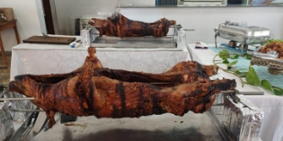 tinha como pratos principais: porco no rolete e churrasco no espeto, além de doces de sobremesa. Os