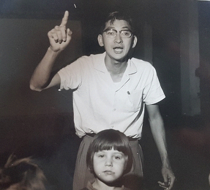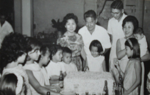 padrinhos Eiko e Massaro Nagamatsu na festa de aniversário de 7 anos, em Paraguaçu Paulista, 1966.