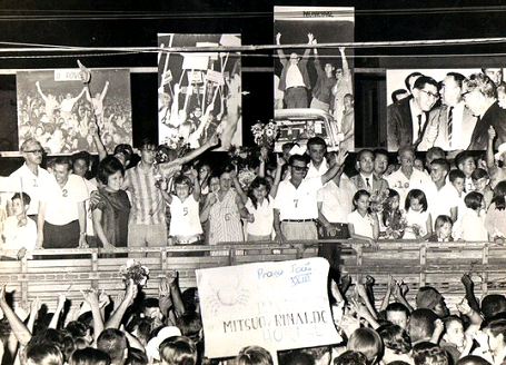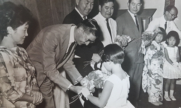 Paulista). 1964. Da esquerda para direita: Kin Saito, Hiroe Nagamatsu entregando flores para Mitsuo,