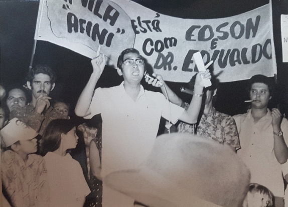 Mitsuo discursando na campanha de Hissagy Marubayashi para prefeito municipal