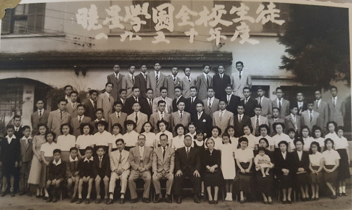 internos no Liceu Aurora 1950. Mitsuo é o 7º na segunda fila dos homens, da direita para esquerda, em pé.